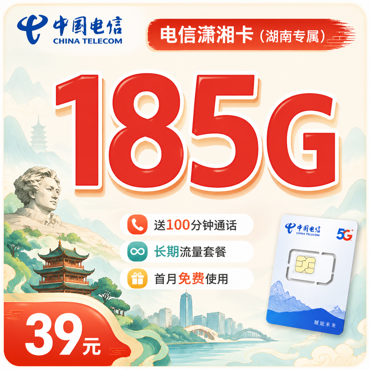 电信潇湘卡39元185G全国流量+长期套餐+湖南专属!套餐构成首月月租免费,套餐50G按天折算;次月起39元155G通用流量+30G定向流量+100分钟归属地湖南不发地区该卡可发湖南全省配送方式京东/顺丰/ESM激活方式自主激活首充渠道强制首充100元办理年龄18-60岁违停复机-套餐合约6个月合约注销方式支持异地注销、营业厅注销,合约期内注销有违约金,违约金=(原套餐月租-当前月租)×已履约月份,如有变动以官方为准