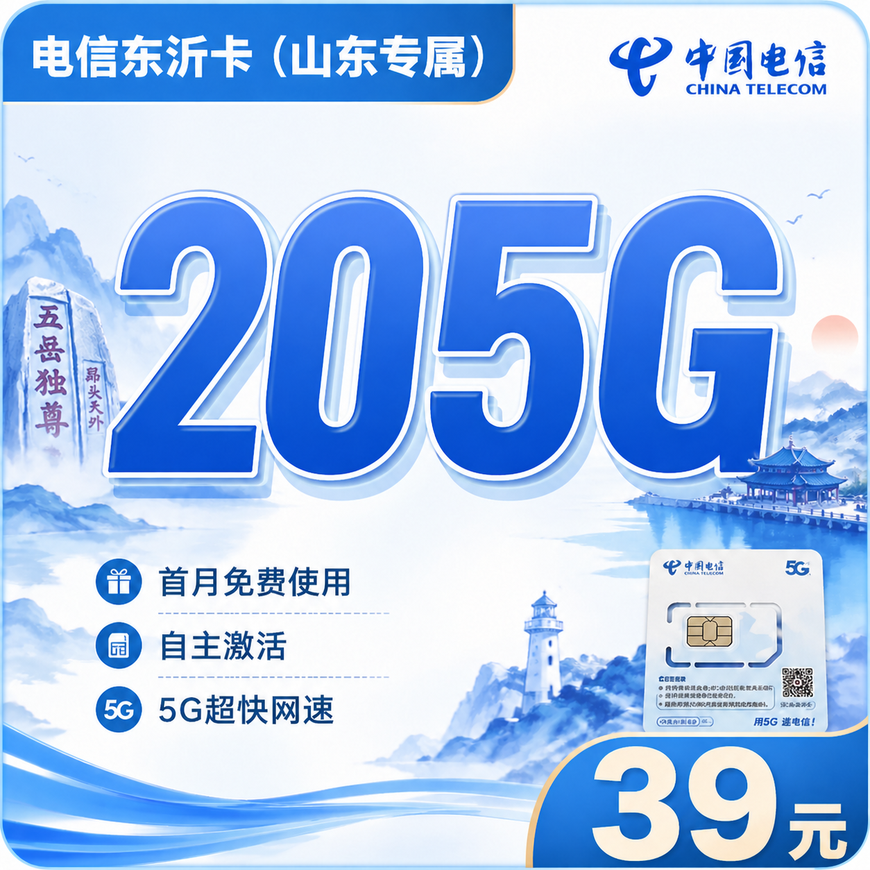 电信东沂卡39元205G全国流量+长期套餐+山东专属!套餐构成首月免费,流量为50G折算到账;激活30天后,39元/月205G流量(50G 本地流量+125G全国流量+30G定向流量)归属地山东不发地区该卡可发山东全省配送方式京东/顺丰/ESM激活方式自主激活首充渠道激活时按照提示充值100元话费办理年龄18-59岁违停复机-套餐合约无合约注销方式支持异地注销、当地营业厅注销、中国电信APP线上注销