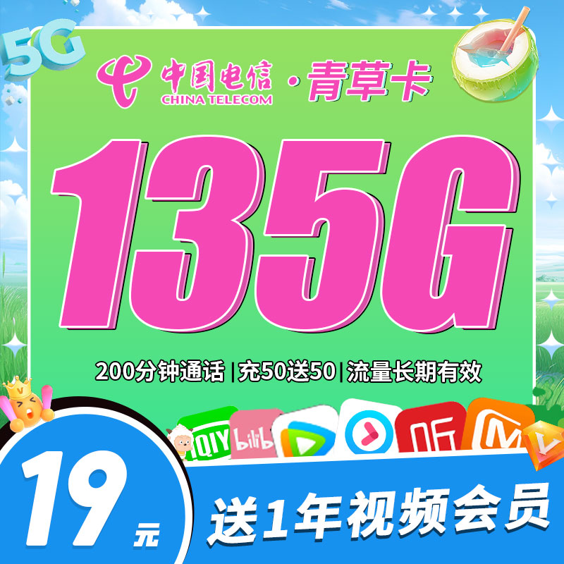 电信青草卡19元135G+200分钟