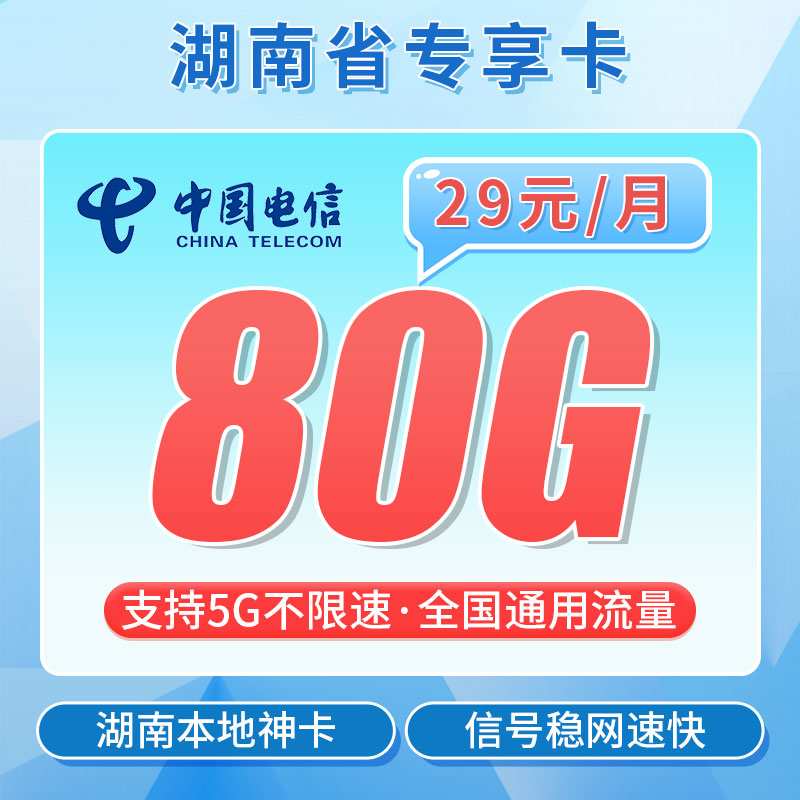 电信湖南卡29元80G归属地:湖南不发货地区:只发湖南备注:-配送方式:顺丰激活方式:自助激活首充渠道:根据说明书充值100元话费办理年龄:18-65岁违停复机:-套餐合约:无合约套餐构成:首月免费,之后长期29元80G注销方式:支持异地注销、当地营业厅注销、中国电信APP线上注销