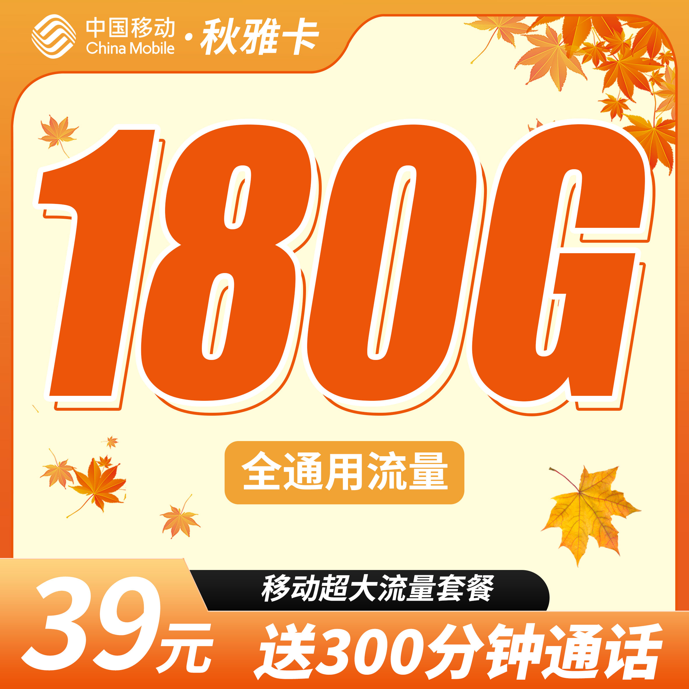 移动秋雅卡39元180G全国通用流量+300分钟通话+超大套餐!