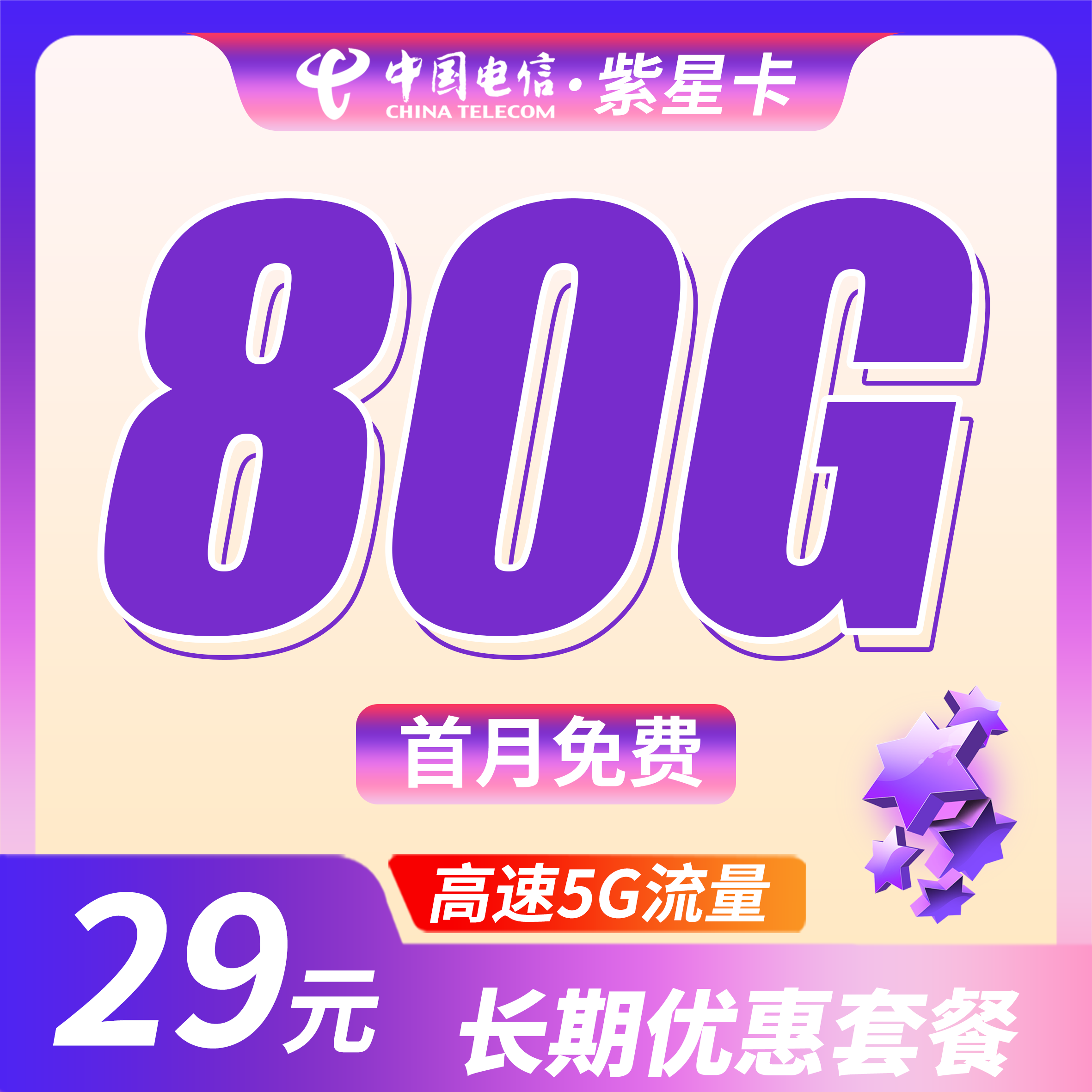 电信紫星卡29元80G全国流量+长期流量套餐!