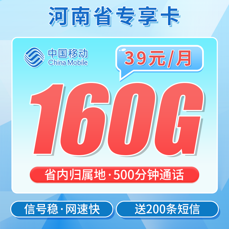 • 首月39元160G按天折算,第2-24个月39元40G全国通用+120G河南省通用流量+500分钟+200条短信,优惠到期后根据运营商政策续约。