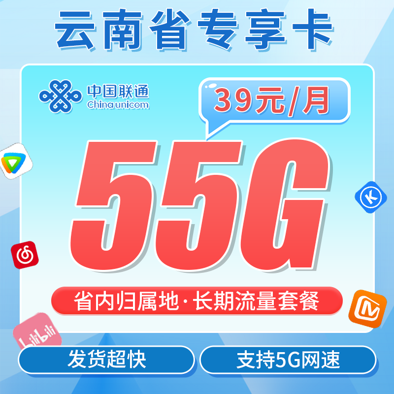 联通云南卡39元55G+云南专属!套餐构成首月全价,次月开始39元/月25G通用流量+15G头条系定向+15G腾讯系定向归属地云南不发地区只发云南配送方式京东快递激活方式上门激活首充渠道任意渠道办理年龄18-60岁违停复机-套餐合约12个月合约注销方式支持异地注销、营业厅注销,合约期内注销有违约金,违约金=(原套餐月租-当前月租)×已履约月份,如有变动以官方为准