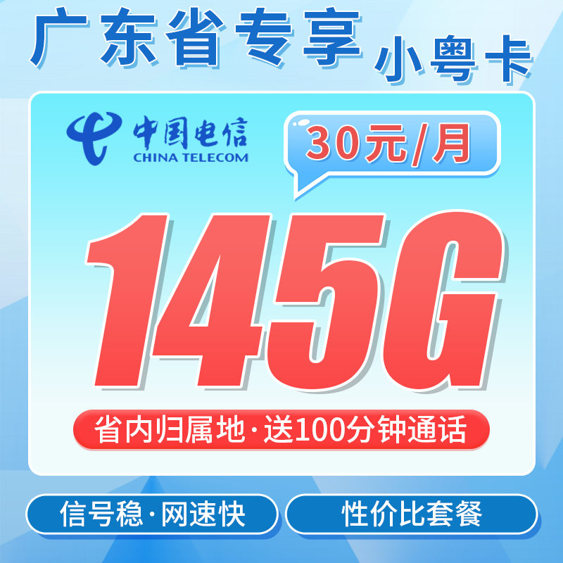 电信小粤卡30元145G全国流量+100分钟+广东专属!