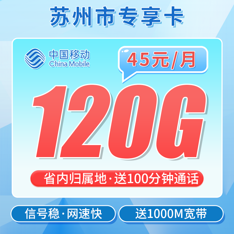 移动苏州卡45元120G+100分钟+1000M宽带+苏州专属