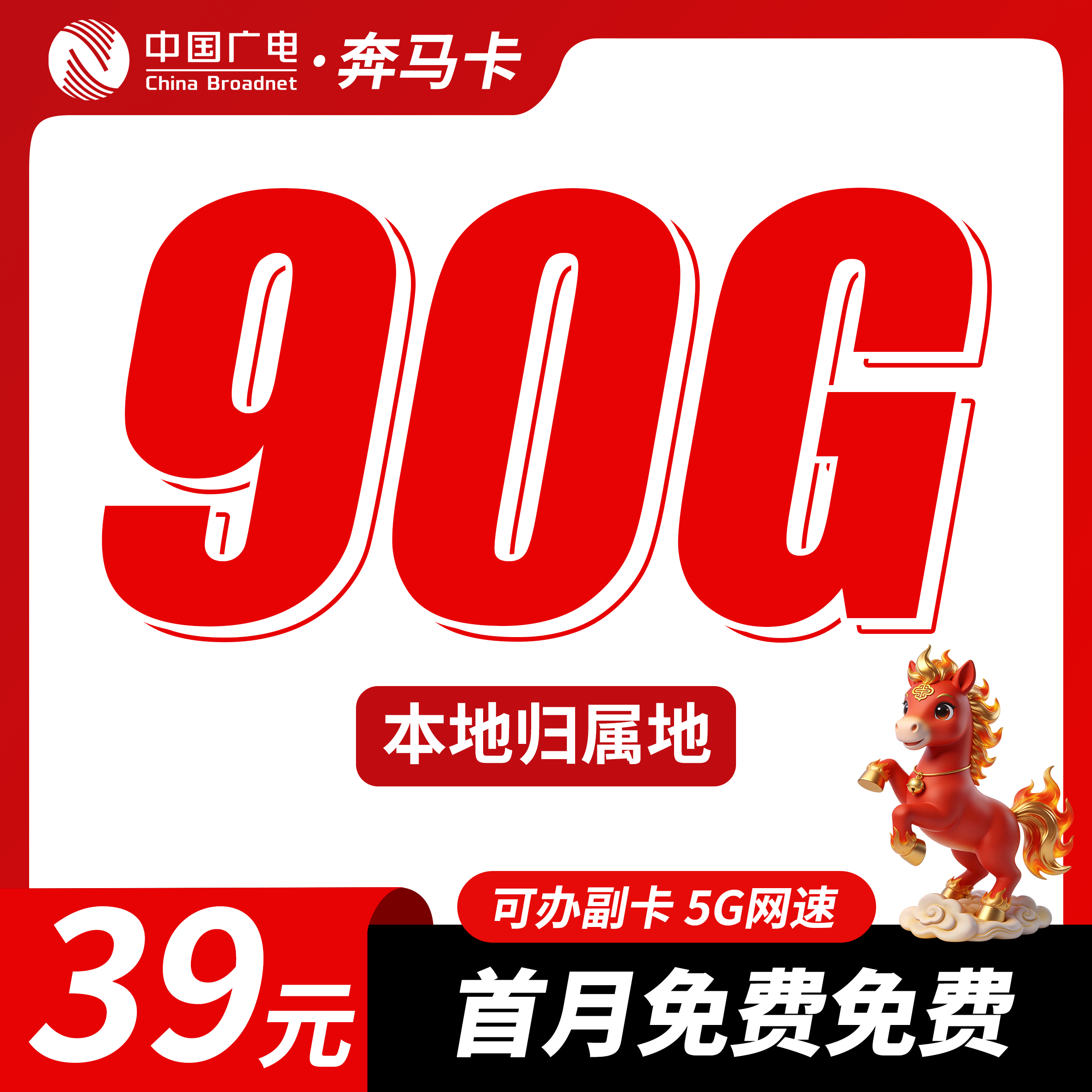 广电奔马卡39元90G+可办理副卡+本地归属地!