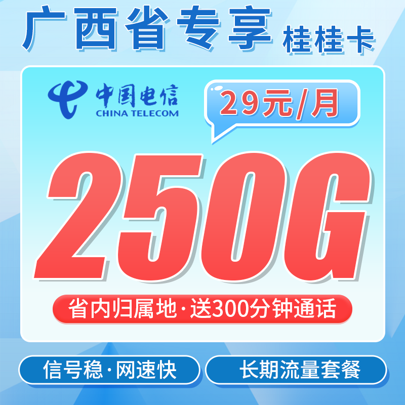 电信桂仁卡29元250G全国流量+300分钟+广西专属!
